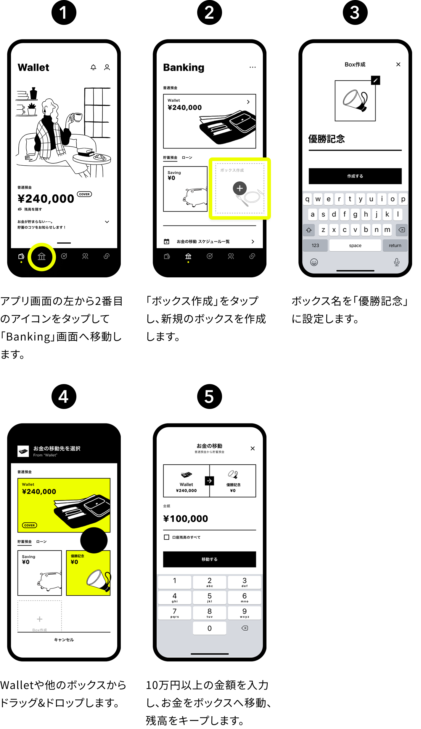 • 名称を「優勝記念」に設定したボックス(貯蓄預金)を作成すること