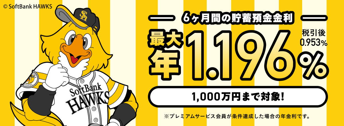 金利上乗せ適用期間中、2025年シーズンの福岡ソフトバンクホークスの最終勝率(0.626)にちなんで年0.626%(税引前)を貯蓄預金金利に上乗せします。