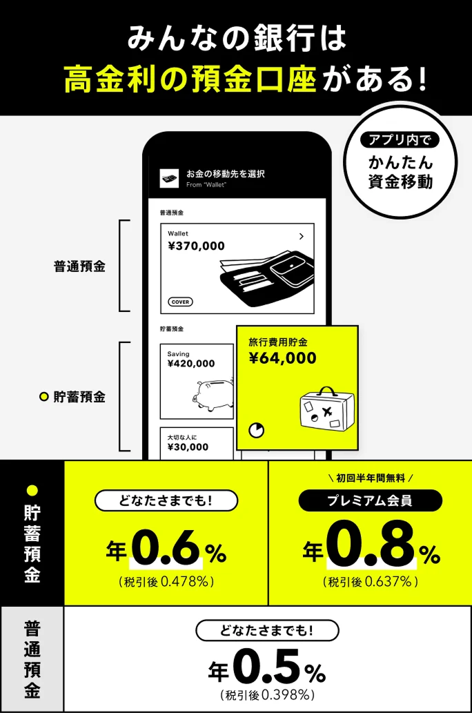みんなの銀行は、貯蓄預金も普通預金もいつでも高金利でお預入れいただけます。